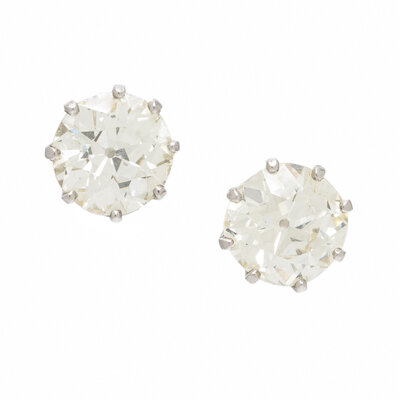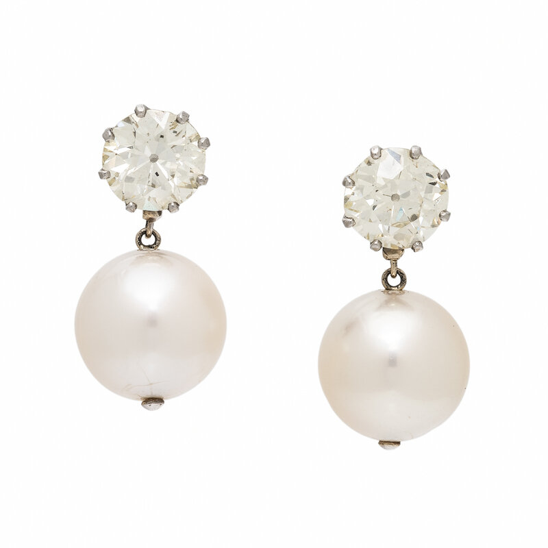 Set with old mine cut diamonds weighing approximately 2.80 and 2.90 carats respectively, with detachable drops set with round cultured pearls measuring approximately 13.10 - 13.25 mm. Mounted in platinum and white gold. 1 inch long, inclusive of drops.