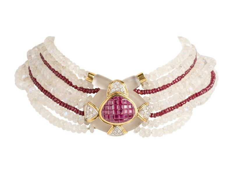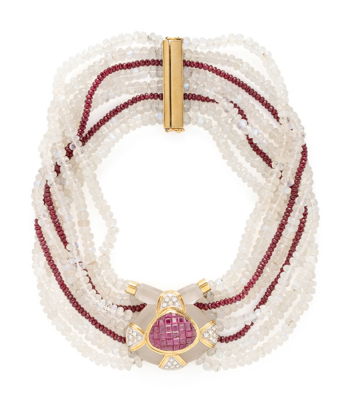 Six strands of faceted moonstone beads measuring approximately 4.95 - 5.50 mm and two strands of faceted ruby beads measuring approximately 2.95 mm, the carved frosted central element with invisibly set calibré cut rubies and pavé-set round diamonds weighing approximately 0.55 carat total. Mounted in 18 karat yellow gold. 13 1/2 inches long, 1 1/2 inches wide.
