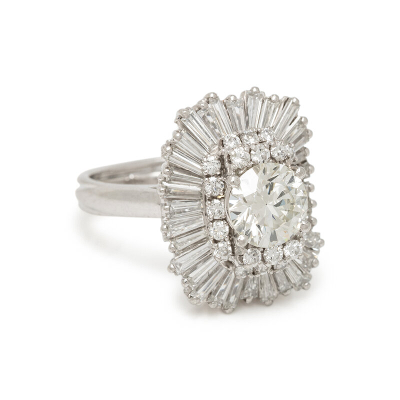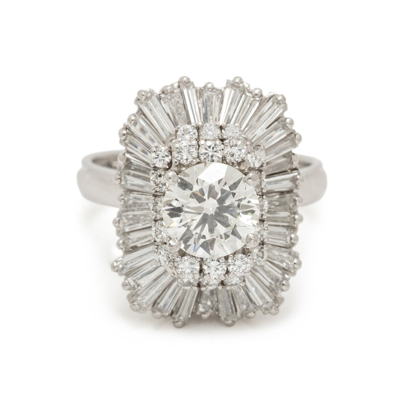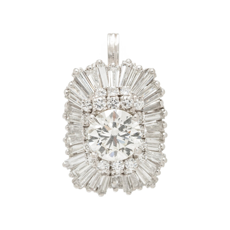 Featuring a round diamond weighing 1.55 carats, framed by round and tapered baguette cut diamonds weighing approximately 1.80 carats total, convertible to a pendant with a latching detachable shank. Mounted in platinum, and the latching element and ring sizer in 14 karat white gold. Ring size 5 1/4.