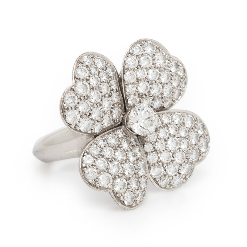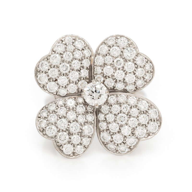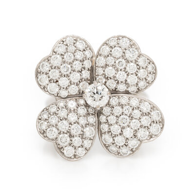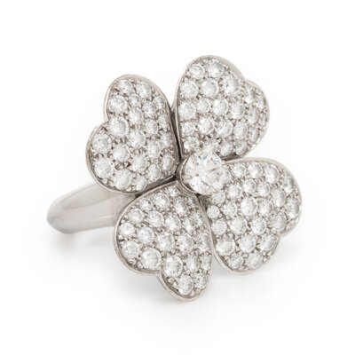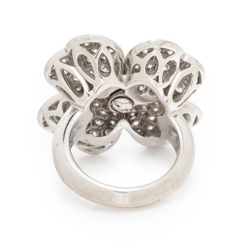 In a four leaf clover design, set with round diamonds weighing approximately 3.65 carats total. Mounted in 18 karat white gold. Ring size 6.