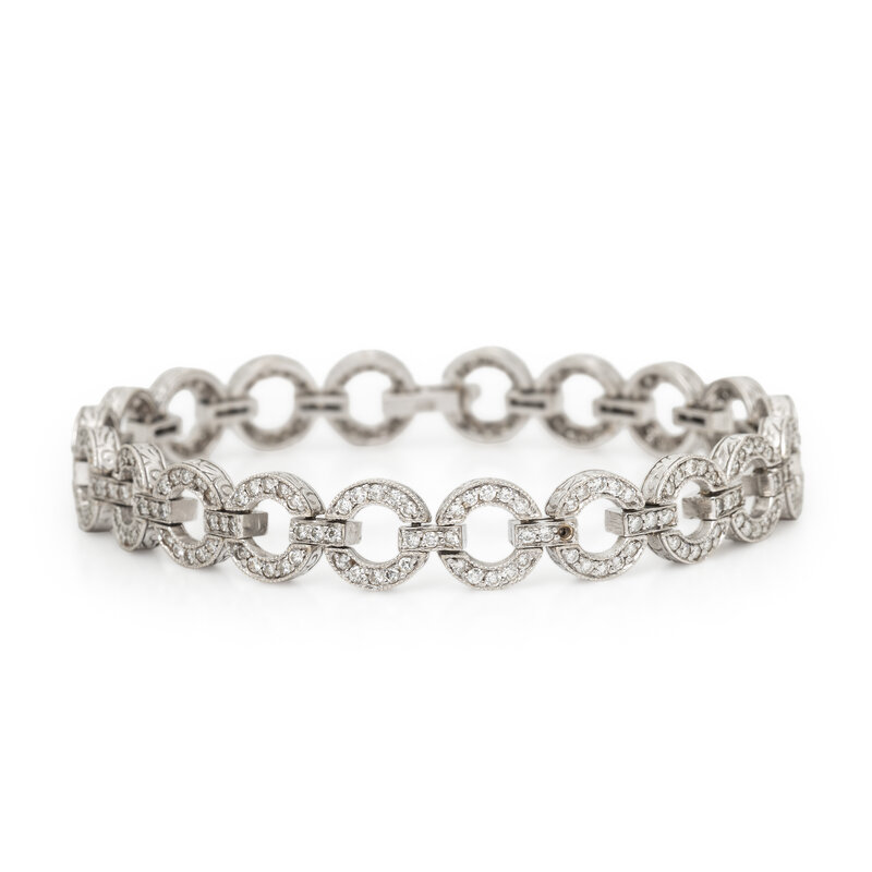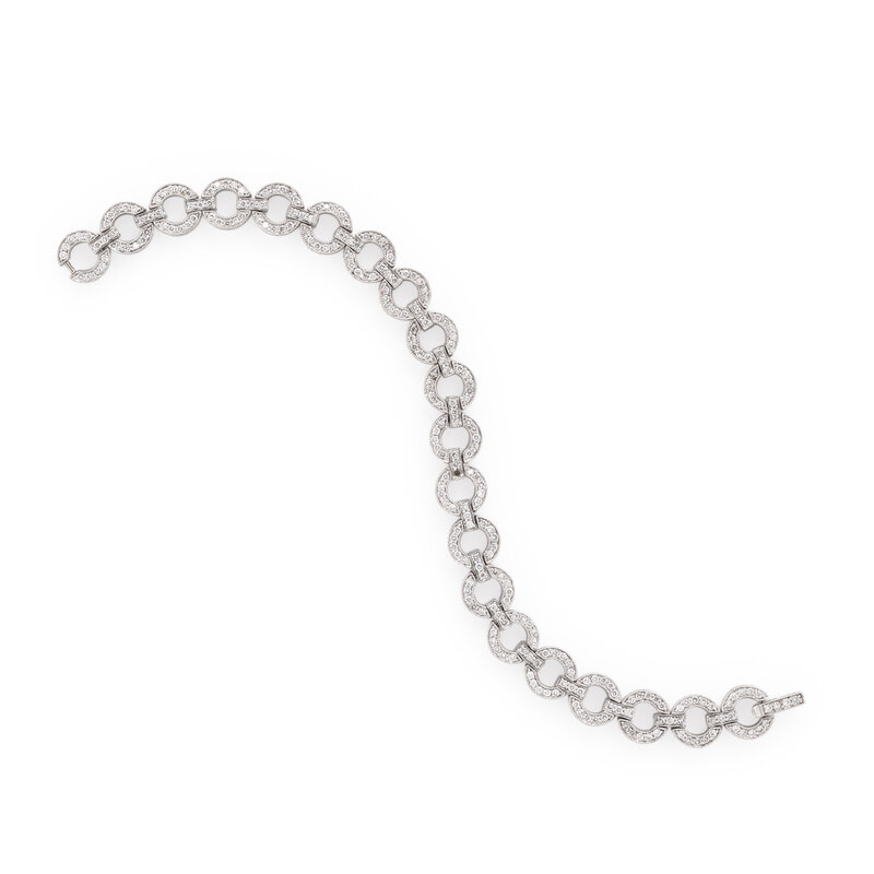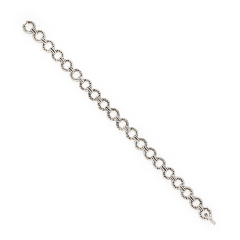 In circular links, the sides featuring scrollwork, set with round diamonds weighing approximately 1.60 carats total. Mounted in 18 karat white gold. 6 3/4 inches long.