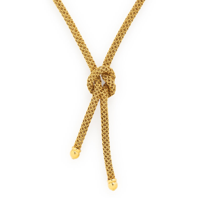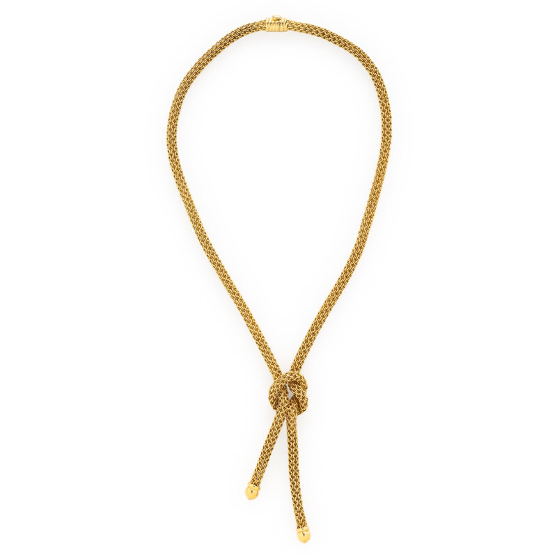 In a knotted lariat design, of tubular mesh-woven chain. 18 karat yellow gold. 21 1/2 inches long.
