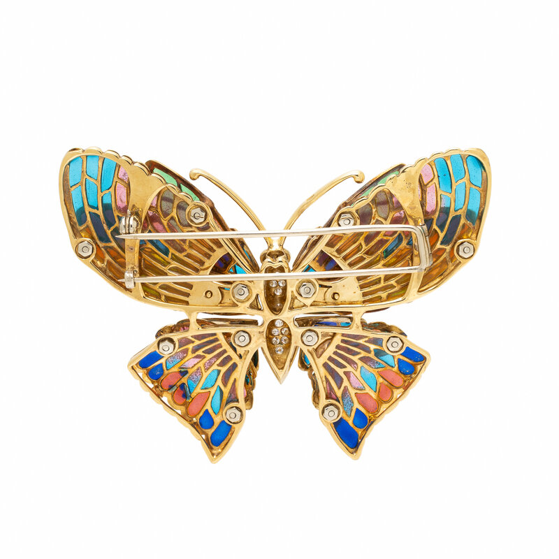 Designed as a butterfly, the wings set with polychrome plique-à-jour enamel and the body set with round diamonds. Mounted in yellow gold. 3 x 2 3/8 inches.