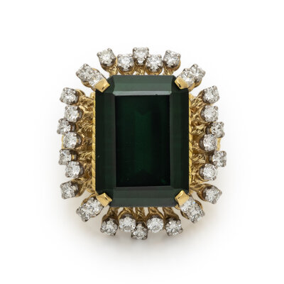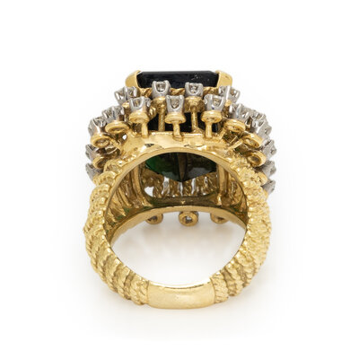Set with an emerald cut green tourmaline weighing approximately 14.50 carats by formula, surrounded by round diamonds weighing approximately 0.85 carat total. Mounted in yellow gold. Ring size 5.