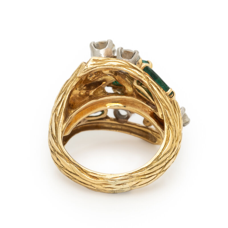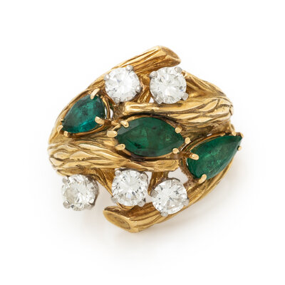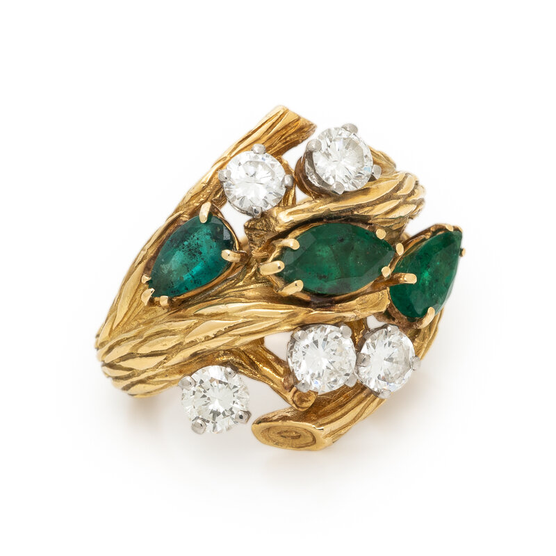 In a branch design, set with pear and marquise shape emeralds and round diamonds weighing approximately 1.15 carats total and pear shape and marquise cut emeralds. Mounted in yellow gold. Ring size 5.