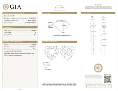 GIA, 2021, Report No. 3415527966, 1.50 carats, F color, SI1 clarity, Faint fluorescence