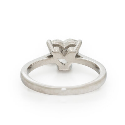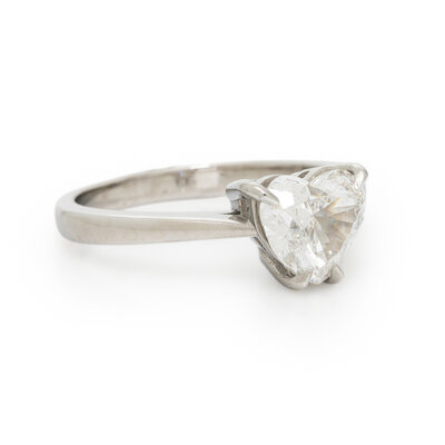 Featuring a heart shape diamond weighing 1.50 carats. Mounted in platinum. Ring size 7.