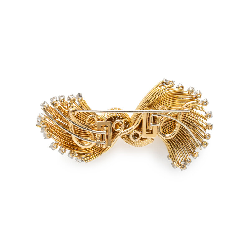 Stylized bow design that may be worn as two spray clips set with round diamonds weighing approximately 5.60 carats total. Mounted in yellow gold. 3 1/4 x 1 1/8 inches.