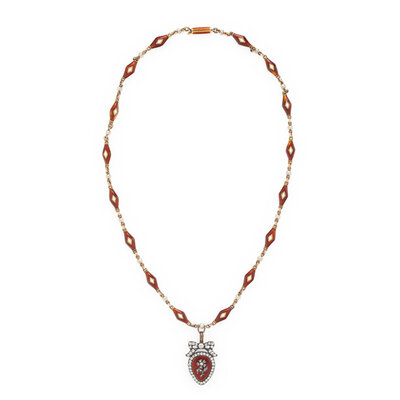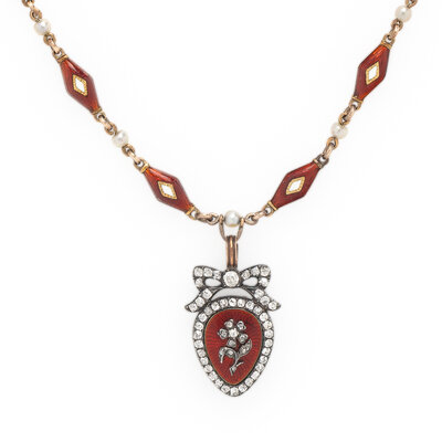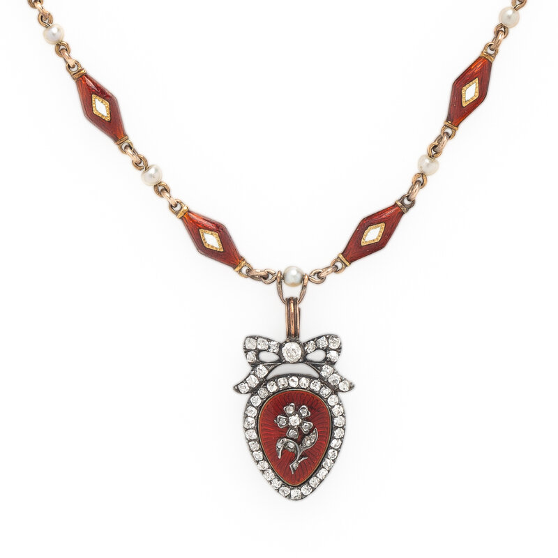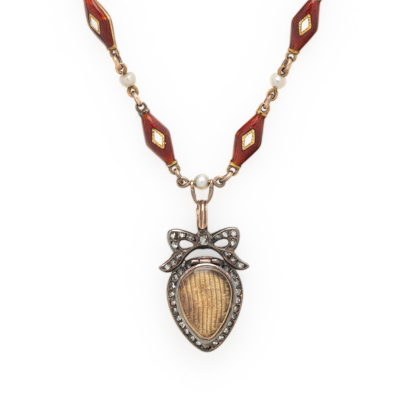 Featuring a pendant designed with bow and flower motifs and set with old European, old mine, and rose cut diamonds and red guilloche enamel, the back set with woven hair within a glazed panel, on a necklace of alternating stations of seed pearls and red and white enameled links. Mounted in silver-topped low karat gold and yellow gold. 14 3/4 inches long, with a 1 inch long drop.