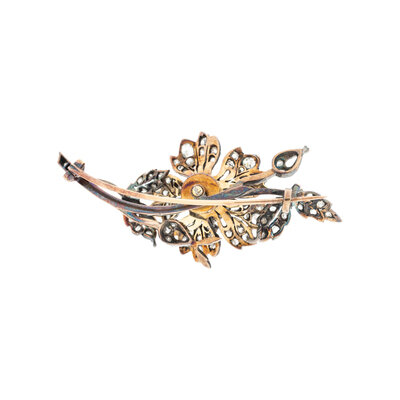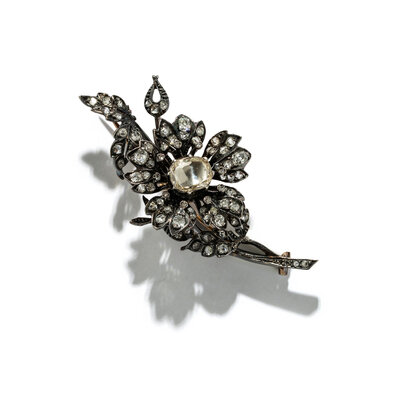 The central en tremblant flower featuring an oval flat top diamond measuring approximately 10.20 x 8.00 mm, additionally set throughout with old mine, old European, and rose cut diamonds. Mounted in silver-topped 18 karat gold. 2 3/4 x 1 1/4 inches.