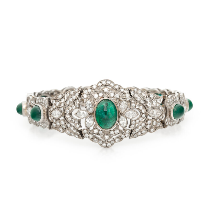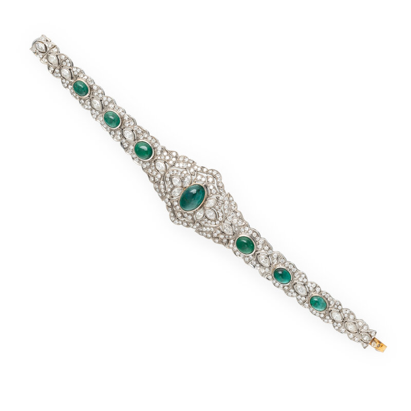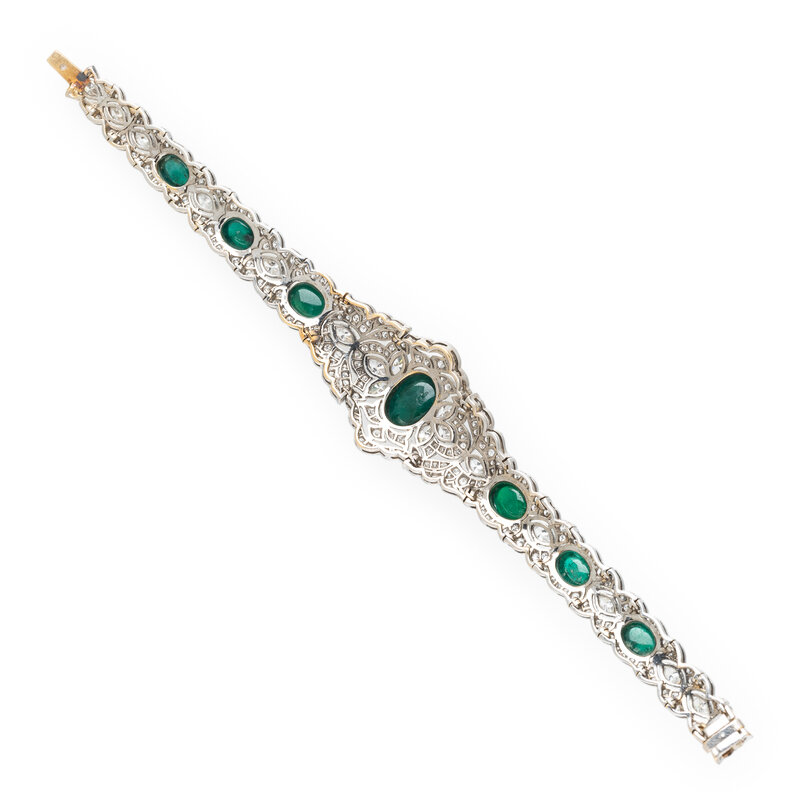 Set with oval cabochon emeralds, the largest weighing approximately 2.90 carats by formula, and marquise and transitional cut diamonds weighing approximately 5.65 carats total. Mounted in white gold. 6 3/4 inches long.