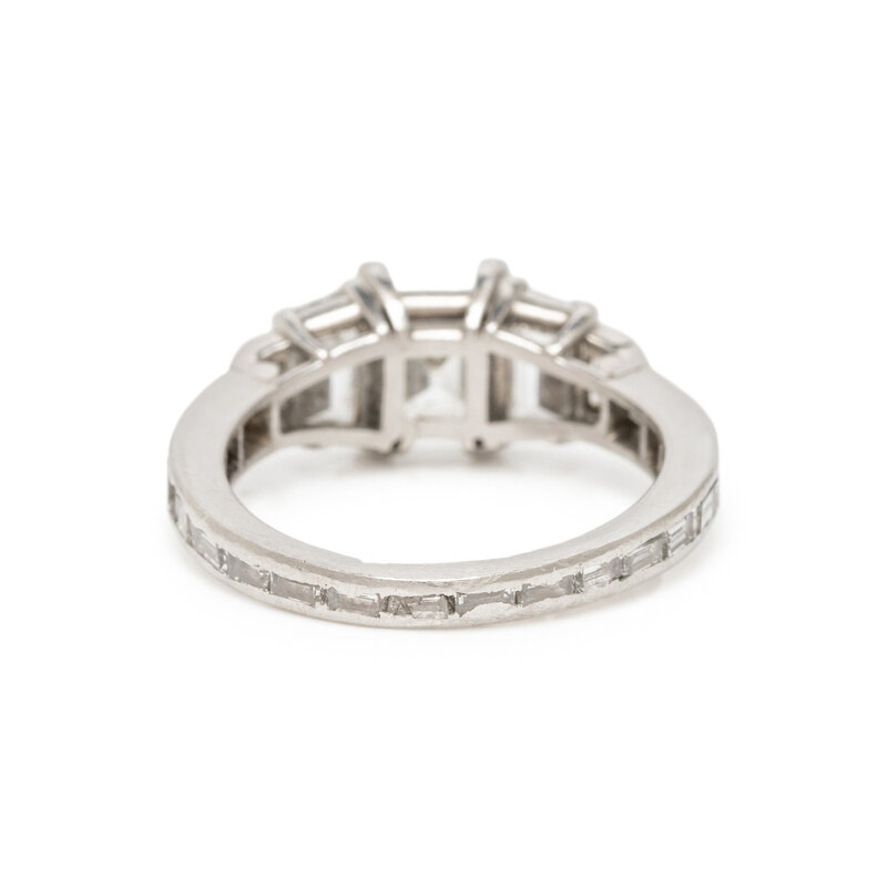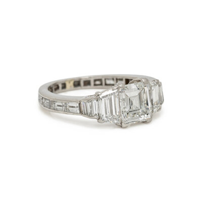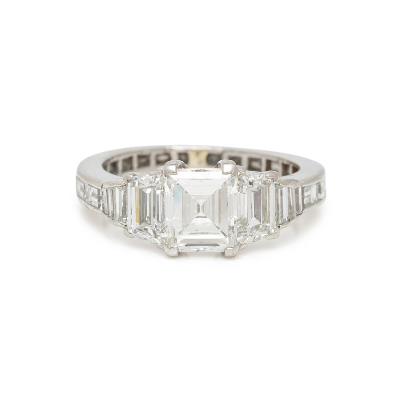 Featuring a cut-cornered rectangular step cut diamond weighing 1.38 carats, flanked by trapezoidal and baguette cut diamonds weighing approximately 0.75 carat total, the shank channel-set with baguette cut diamonds weighing approximately 0.60 carat total. Mounted in platinum. Ring size 6 1/4.
