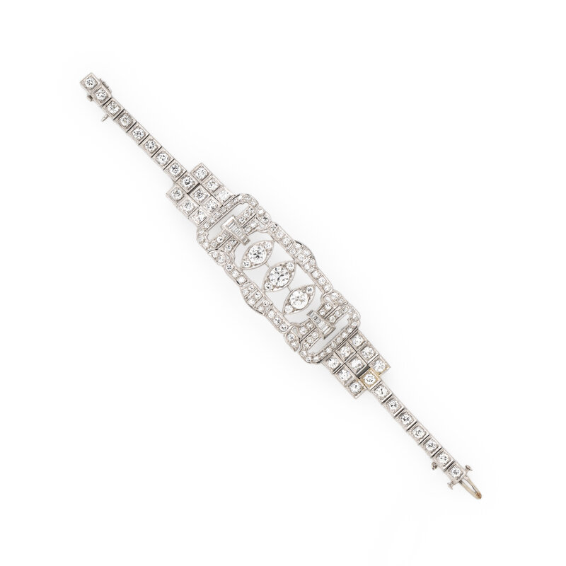 Designed with a plaque with openwork and marquise-shaped motifs, set throughout with transitional, old European, baguette, and single cut diamonds weighing approximately 7.50 - 8.00 carats total, accented with milgrain. Mounted in platinum. 5 3/4 inches long.