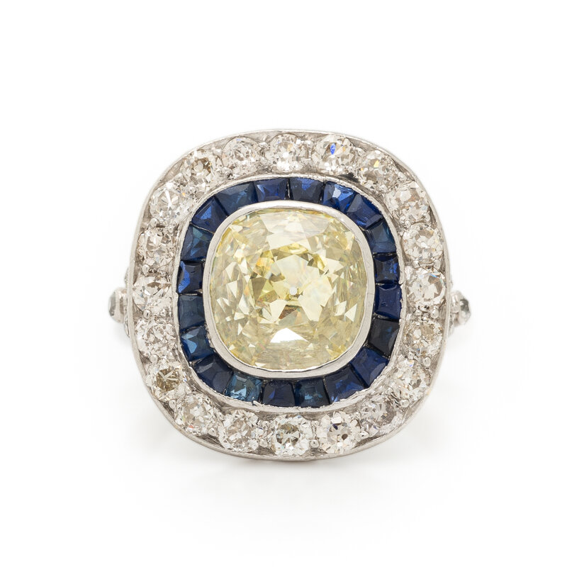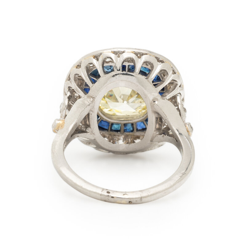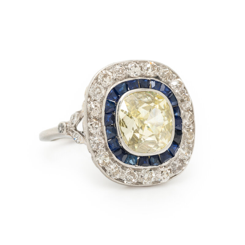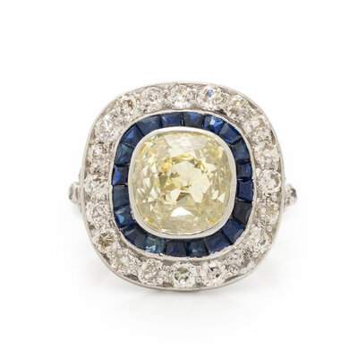 Centered by an antique cushion cut yellow diamond (origin of color not tested) weighing approximately 2.40 - 2.80 carats by formula, with calibré cut sapphires and old European cut diamonds weighing approximately 1.10 carats total set into the shoulders and outer halo. Mounted in platinum. Ring size 6 1/2.