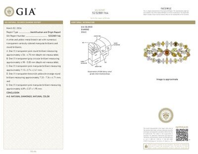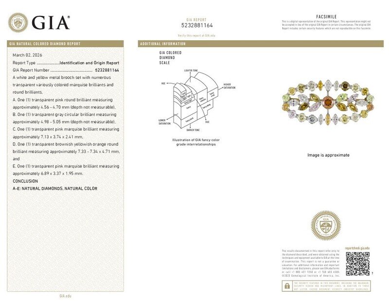 GIA, 2026, Report No. 5232881164, A. One transparent pink round brilliant, B. One transparent gray circular brilliant, C. One transparent pink marquise brilliant, D. One transparent brownish yellowish orange round brilliant, E. One transparent pink marquise brilliant, A-E; Natural Diamonds, Natural Color