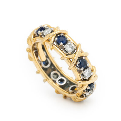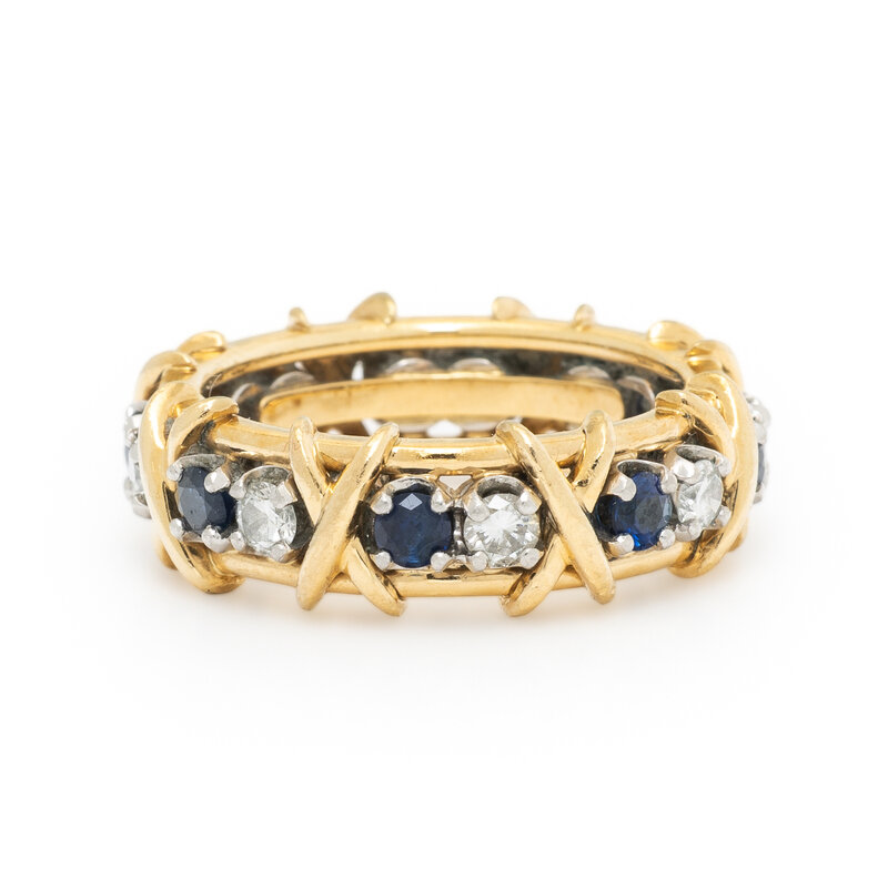 Designed with 'X' motifs, set with round diamonds weighing approximately 0.55 carat total and round sapphires. Mounted in 18 karat yellow gold and platinum. Ring size 7 1/2.