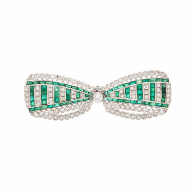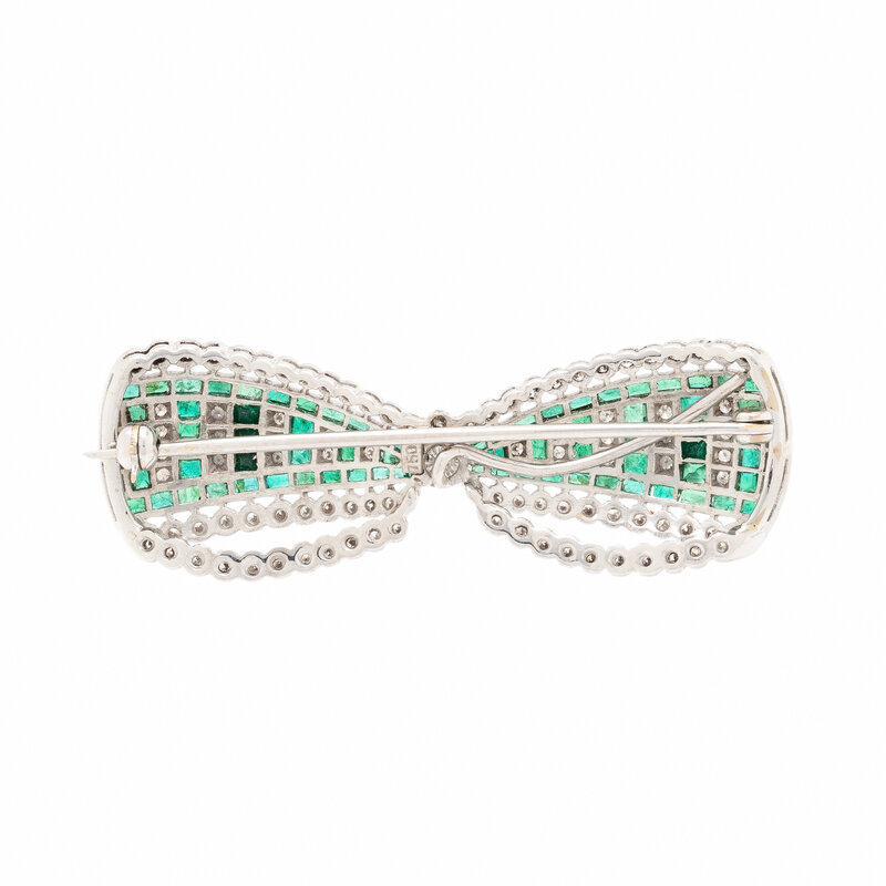 EMERALD, DIAMOND, AND WHITE GOLD BOW BROOCH