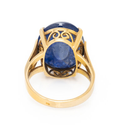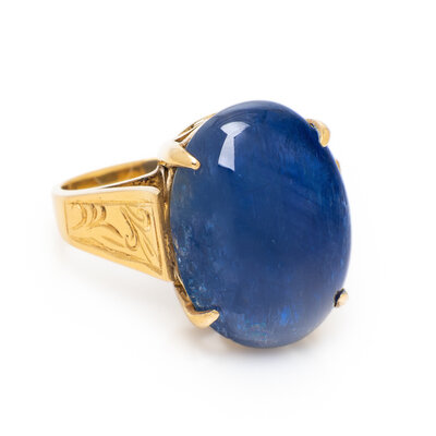 Featuring an oval cabochon unheated Burmese sapphire weighing approximately 15.50 carats by formula. Mounted in 18 karat yellow gold. Ring size 6.