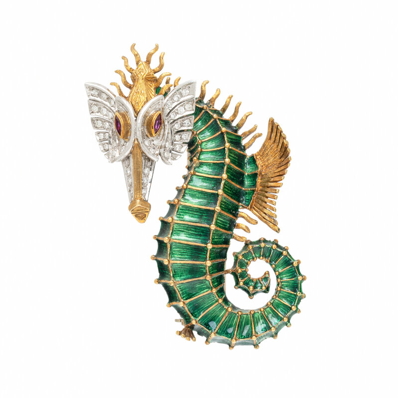 Designed as a sea dragon, set with single cut diamonds, marquise cut rubies, and green enamel. Mounted in 18 karat yellow and white gold. 2 1/2 x 1 1/4 inches.