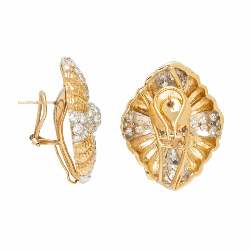 In a lozenge shape, set with clusters of round and marquise cut diamonds weighing approximately 9.00 - 10.00 carats total. Mounted in 18 karat yellow and white gold. 1 1/2 inches long.