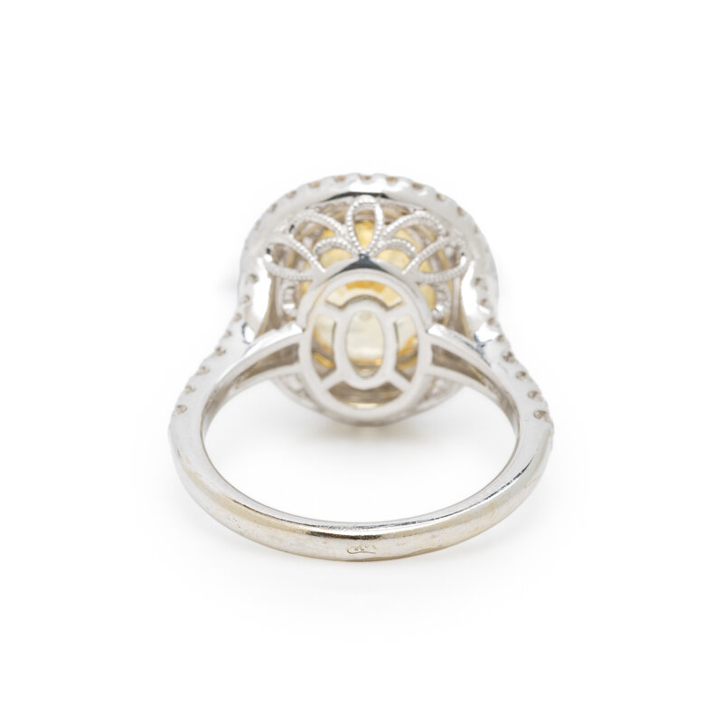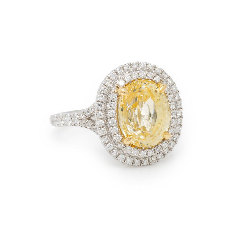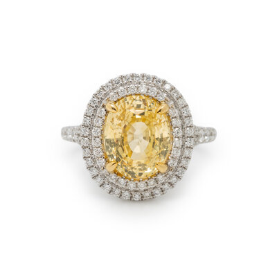 Featuring an oval yellow sapphire weighing 5.73 carats, surrounded by a double halo of round diamonds and additional round diamonds leading down the shank weighing approximately 0.60 carat total. Mounted in 18 karat white gold. Ring size 6 3/4.