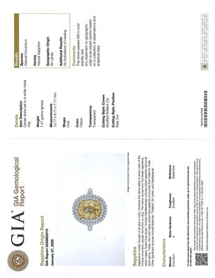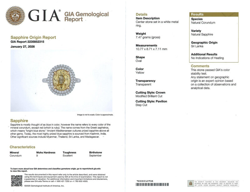GIA, 2026, Report No. 2235852315, Natural Corundum, Natural Sapphire, Yellow, Sri Lanka, No Indications of Heating
