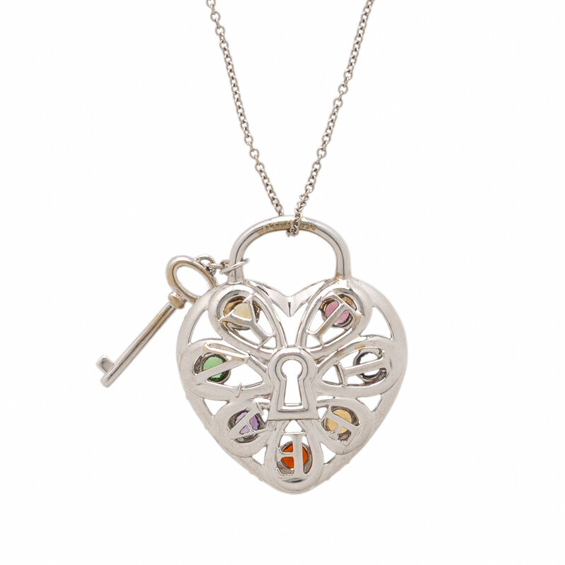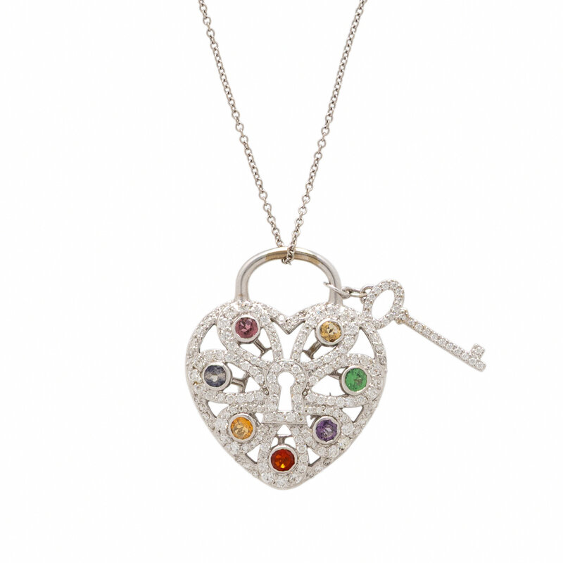 Designed as a heart-shaped lock and key, the pendant set with round pink tourmaline, iolite, orange fire opal, yellow fire opal, amethyst, tsavorite garnet, citrine, and round diamonds weighing approximately 0.97 carat total. Mounted in 18 karat white gold. Pendant: 1 1/8 inches long. Chain: 17 1/2 inches long.