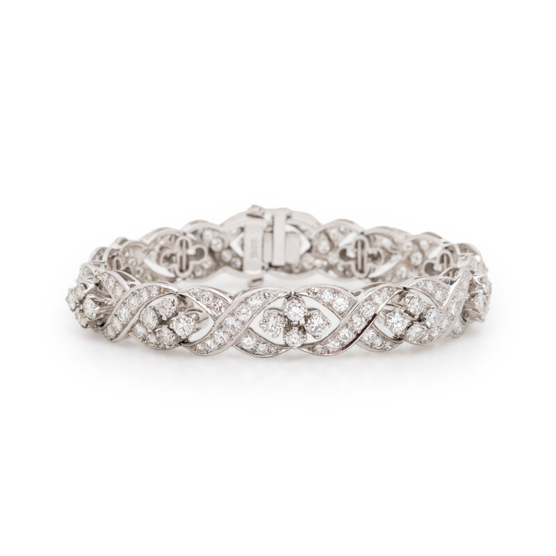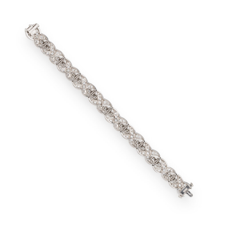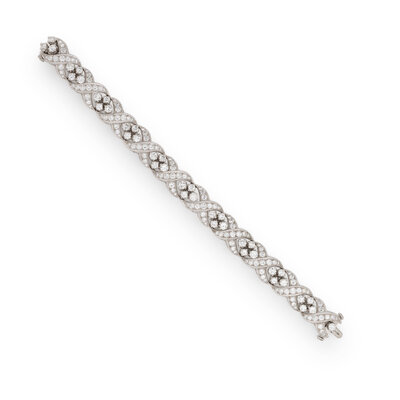 Designed with 'X' links, featuring round diamonds weighing approximately 11.95 carats total. Mounted in platinum. 7 inches long.