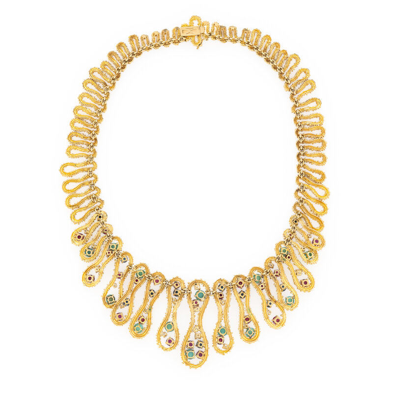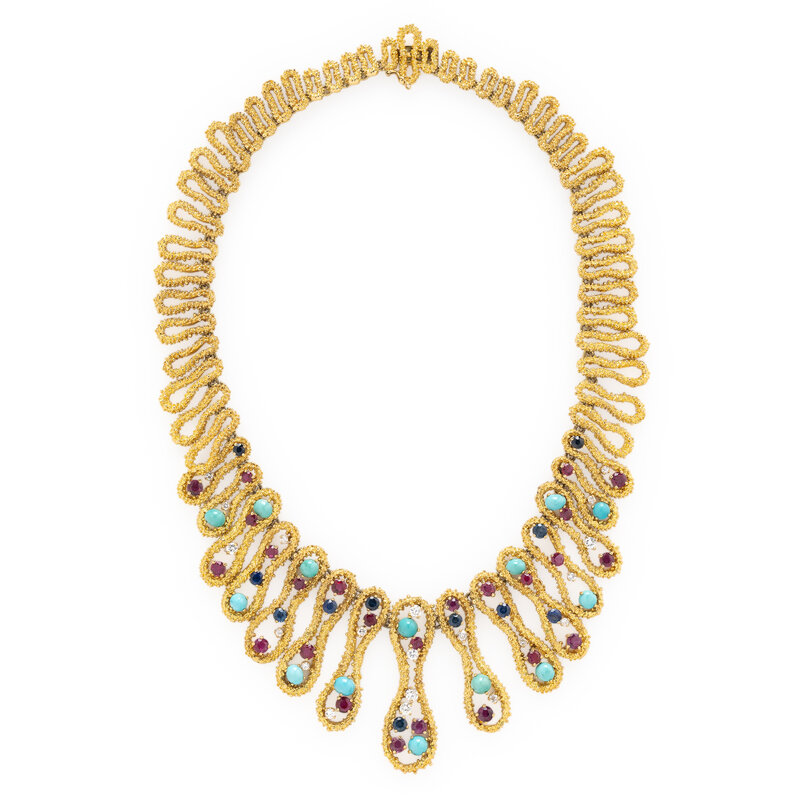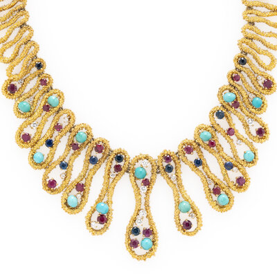Composed of graduated bead-textured links, set with round diamonds weighing approximately 1.50 carats total, round rubies, round sapphires, and round and oval cabochon turquoise. Mounted in yellow gold. 17 1/2 inches long.