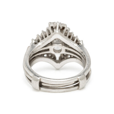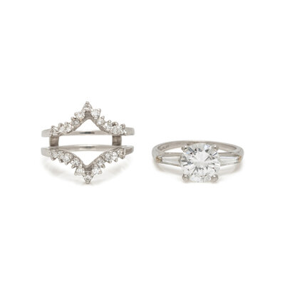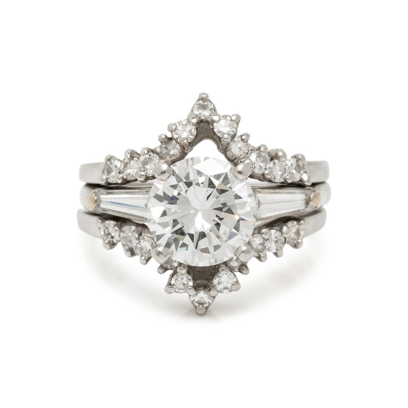 Featuring a round diamond weighing 2.00 carats, flanked by tapered baguette cut diamonds weighing approximately 0.20 carat total, accompanied by a jacket set with round and single cut diamonds weighing approximately 0.25 carat total. Mounted in platinum and 14 karat white gold. Ring size 6.