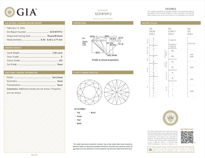 GIA, 2026, Report No. 5231872912, 2.00 carats, E color, SI2 clarity, No fluorescence