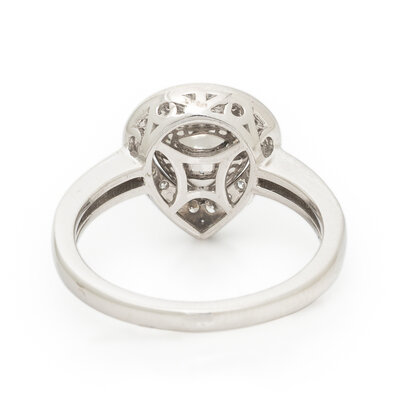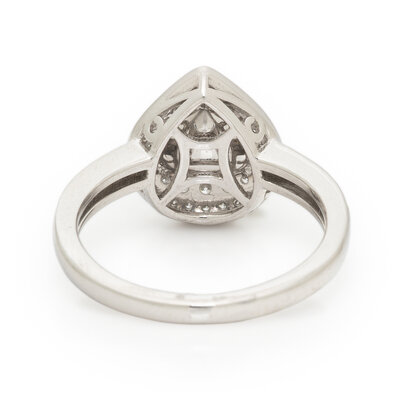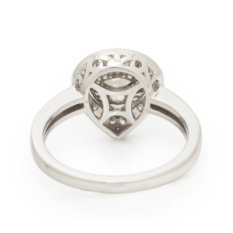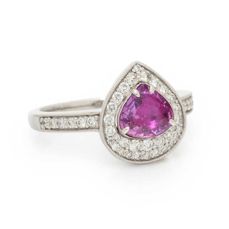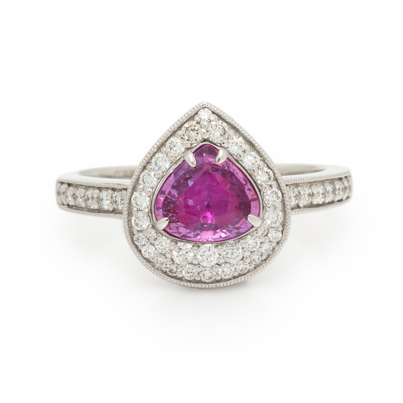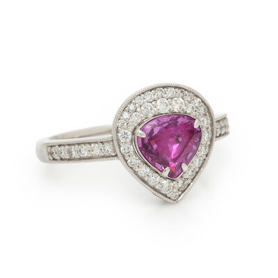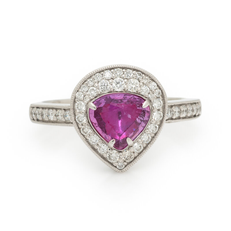 Featuring a pear mixed cut unheated pink sapphire weighing 1.06 carats, accented with round diamonds weighing approximately 0.37 carat total. Mounted in platinum. Ring size 7.