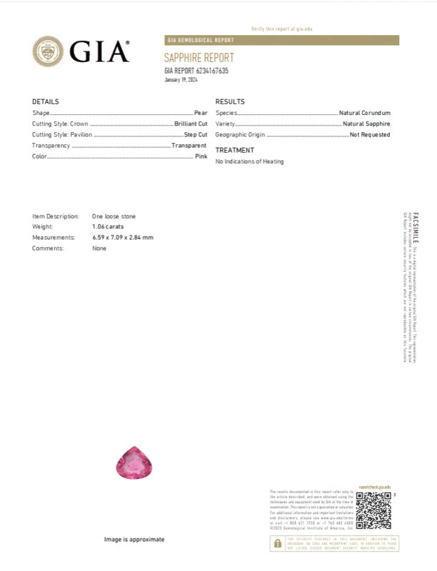GIA, 2024, Report No. 6234167635, Natural Corundum, Natural Sapphire, Pink, No Indications of Heating