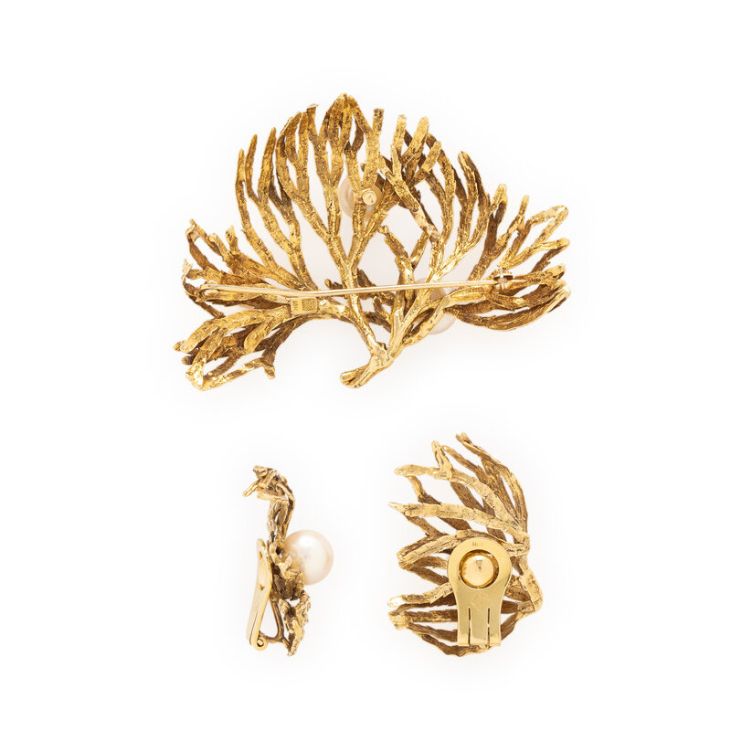 MARIANNE OSTIER, CULTURED PEARL AND YELLOW GOLD EARRINGS AND BROOCH