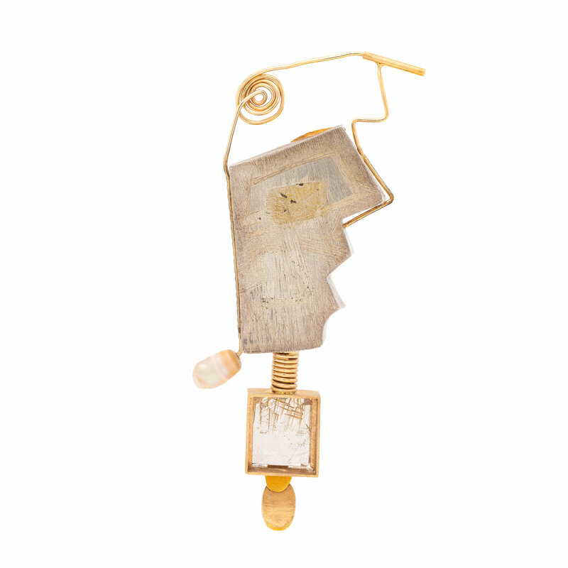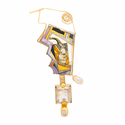 In an avant-garde design, set with cloisonné enamel, a baroque cultured pearl, emerald cut rutilated quartz, and an oval cabochon moonstone. Mounted in silver and yellow gold. 4 1/4 x 1 3/8 inches.