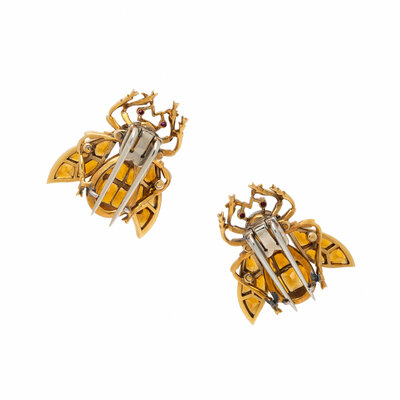 A pair of brooches designed as bees, set with round and freeform cabochon citrines and round cabochon rubies. Mounted in yellow gold. Each 1 x 7/8 inches.