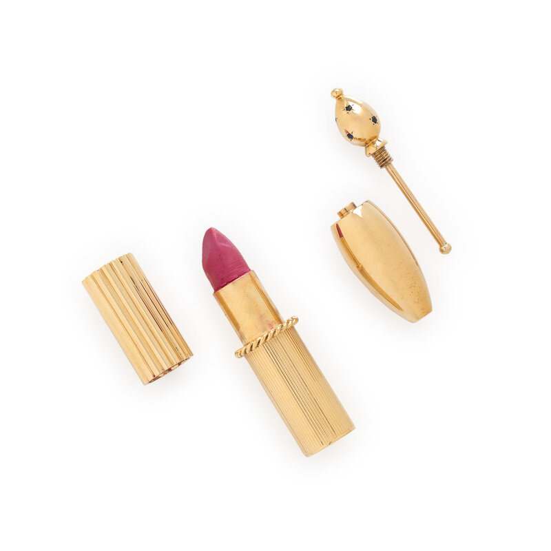 Including a lipstick case and a perfume bottle, the top of which is set with round sapphires. Mounted in 14 karat yellow gold. Lipstick case: 2 3/4 x 1/2 inches. Perfume bottle: 2 1/4 x 1/2 inches.