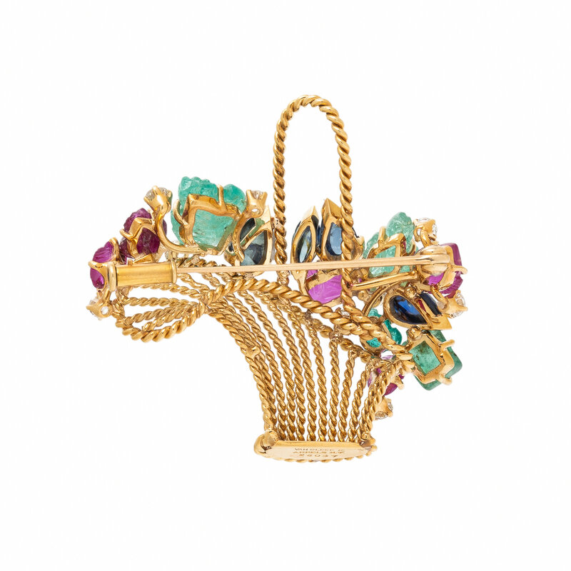 VAN CLEEF & ARPELS, MULTIGEM AND YELLOW GOLD BASKET BROOCH