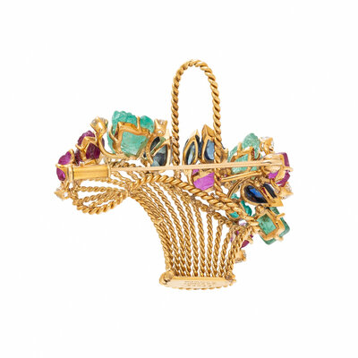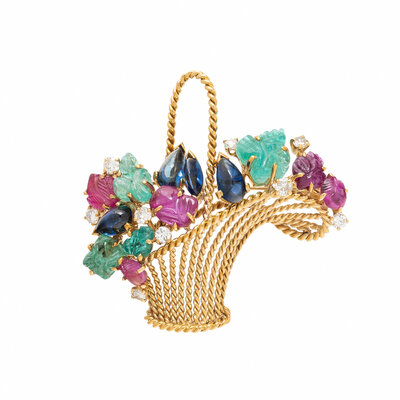 Designed as a flower basket, set with carved rubies, carved emeralds, pear shape and marquise cut cabochon sapphires, and round diamonds. Mounted in yellow gold. 1 1/2 x 1 1/2 inches.