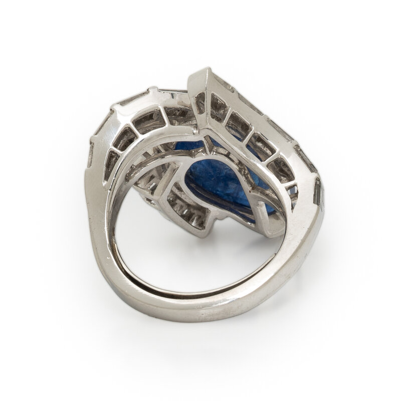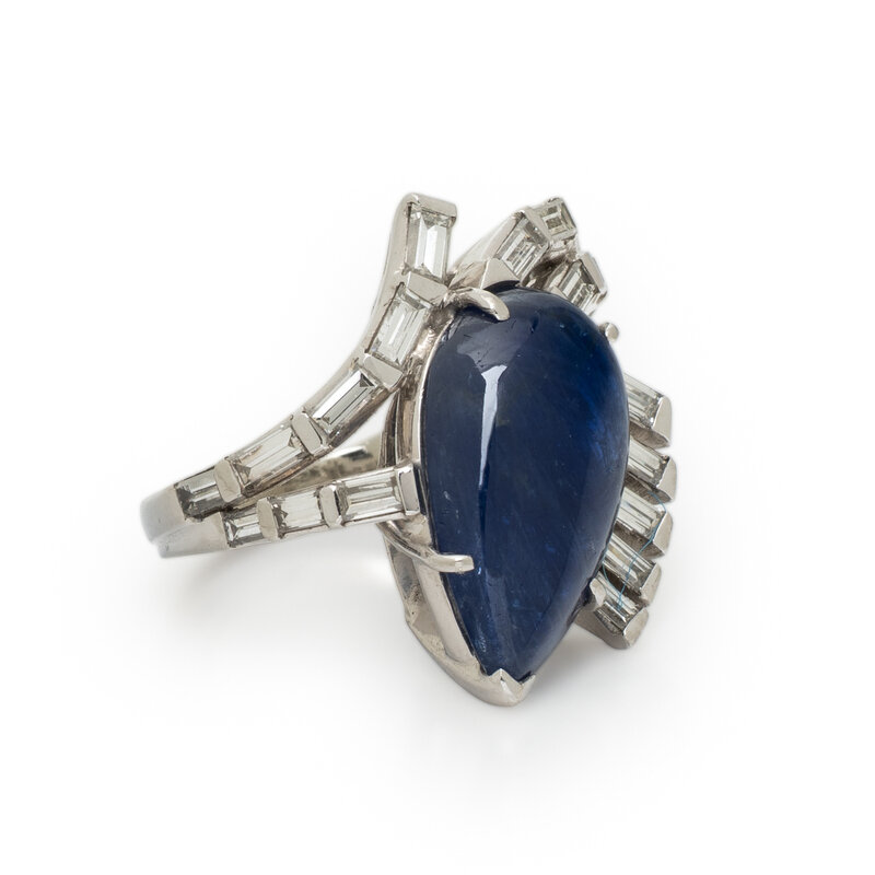 Featuring a pear shape cabochon unheated Burmese sapphire weighing approximately 10.00 - 11.00 carats by formula, accented with baguette cut diamonds weighing approximately 1.10 carats total. Mounted in platinum. Ring size 4 1/4.