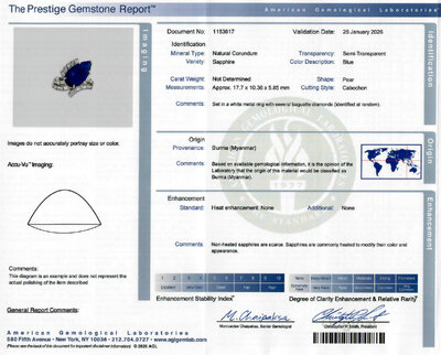 AGL, 2026, Report No. 1153617, Natural Corundum, Sapphire, Burma (Myanmar), Heat enhancement: None