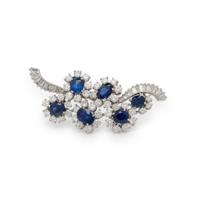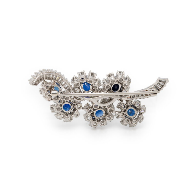 In a foliate design, featuring a cluster of oval cut sapphire flowers amidst a swirl of round and baguette cut diamonds weighing approximately 4.30 carats total. Mounted in platinum. 2 x 3/4 inches.