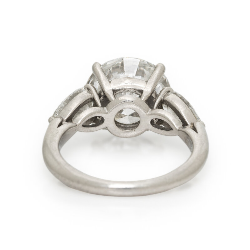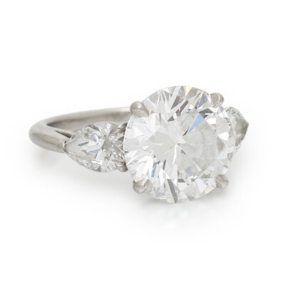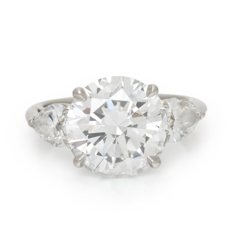Featuring a round diamond weighing 5.19 carats, flanked by pear shape diamonds weighing approximately 1.20 carats total. Mounted in platinum. Ring size 5 3/4.