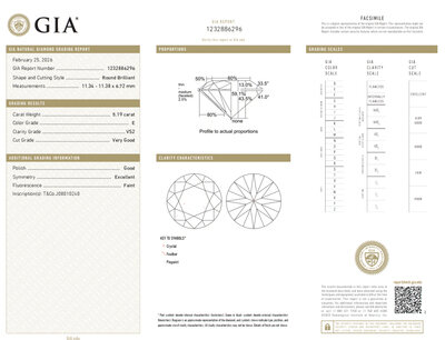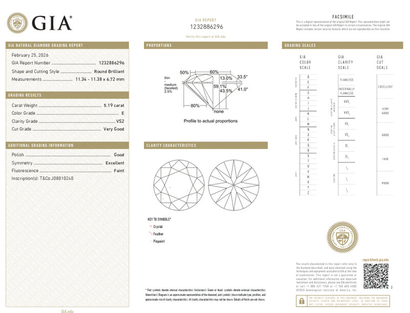 GIA, 2026, Report No. 1232886296, 5.19 carats, E color, VS2 clarity, Faint fluorescence