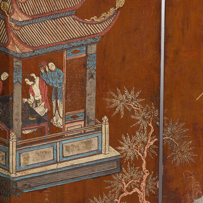 The front is finely carved and painted with a continuous scene depicting a joyous gathering of figures on a fenced terrace and within pavilions. All bordered by foliate scrolls above a row of fan-shaped panels enclosing scholars, which rests over a lower register of medallions featuring mythical beasts. The reverse is carved with inscriptions detailing "The 18 Scenic Spots of Jinling" (金陵十八景) all situated above various auspicious objects.