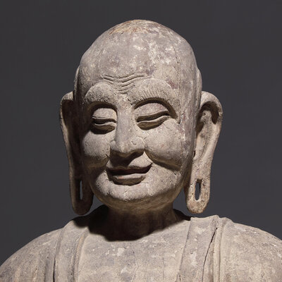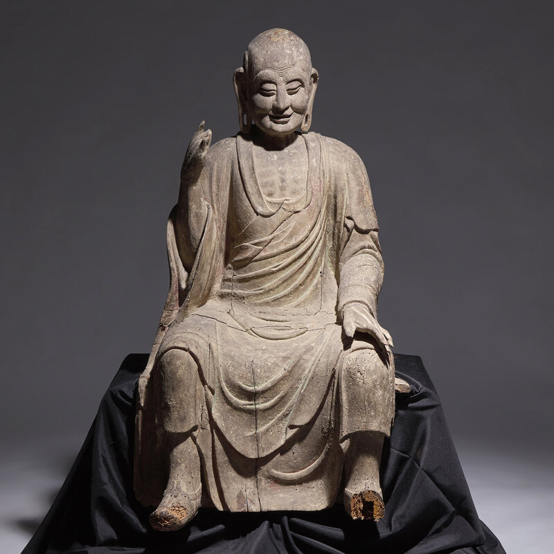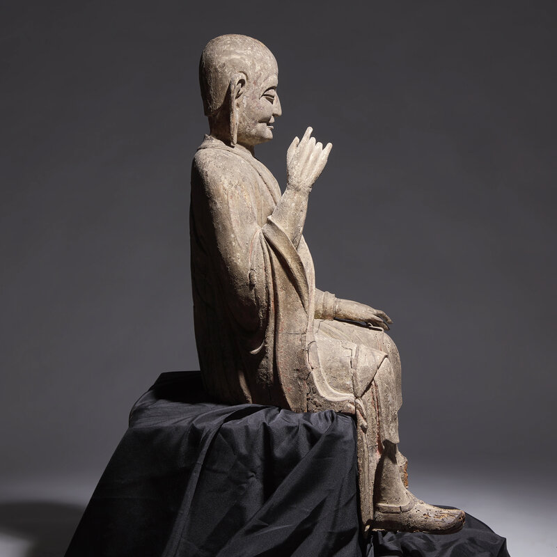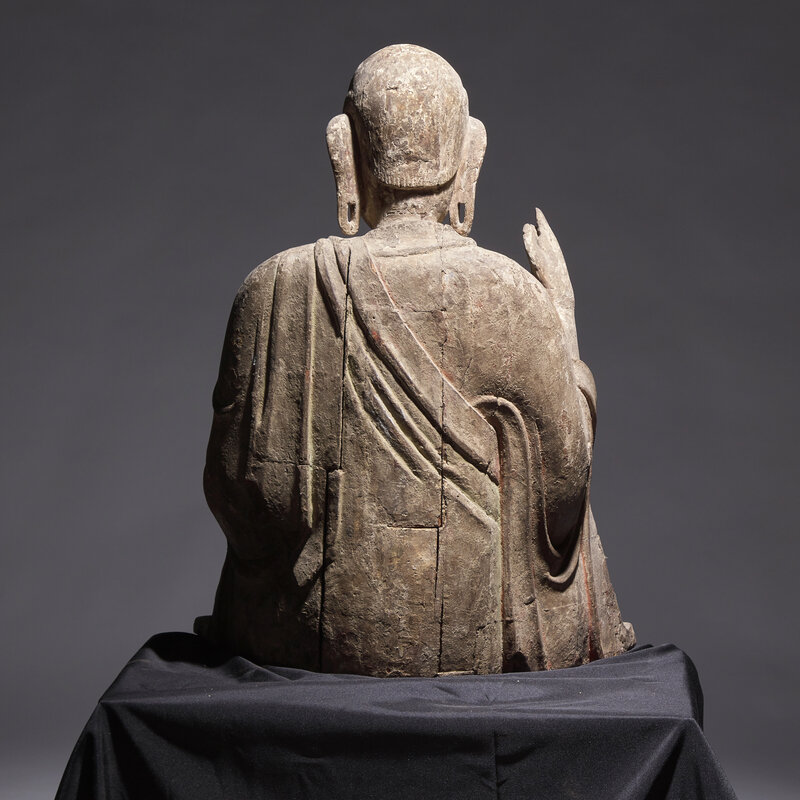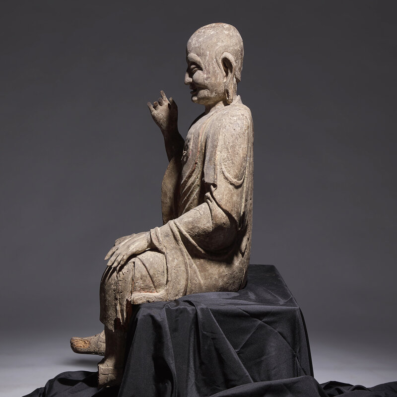 A Large Chinese Carved Wood Seated Figure of Luohan, Ming Dynasty