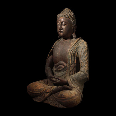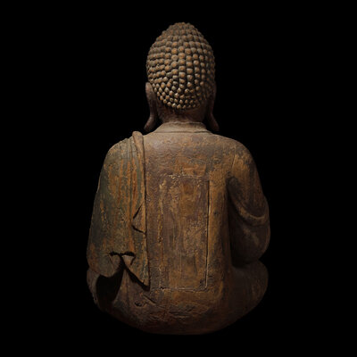 A Large Chinese Seated Parcel-Gilt Carved Wood Figure of the Buddha, Ming Dynasty