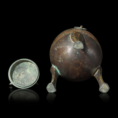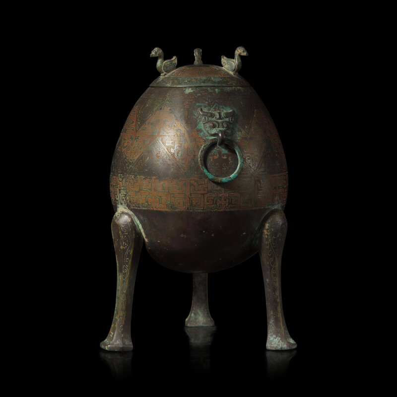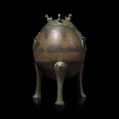 Of ovoid form, the exterior is finely decorated with bands of copper inlay depicting taotie masks and stylized kui dragons. The vessel is applied to each side with an ox mask suspending a loose-ring handle, and raised on three slender tapering legs similarly inlaid with copper. The domed cover is surmounted by three finials in the form of seated geese, designed to serve as feet when the cover is inverted.