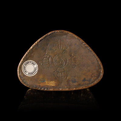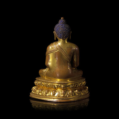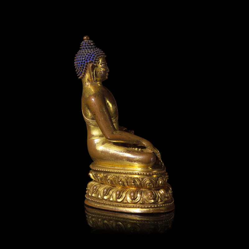 Elegantly modeled and with engraved hem borders, seated in padmasana, his right hand in bhumisparsha mudra, a vajra before him, raised on a double lotus base, sealed, the base plate engraved with a visvavajra.