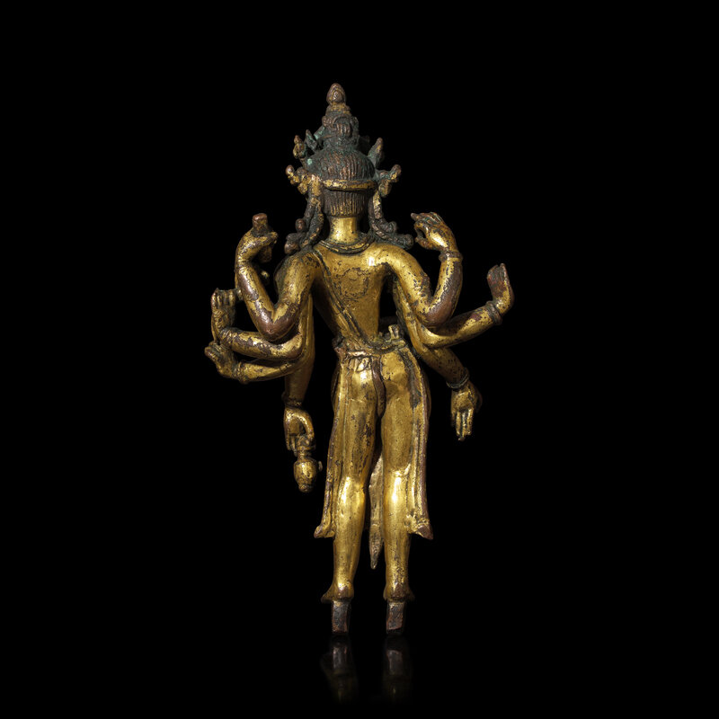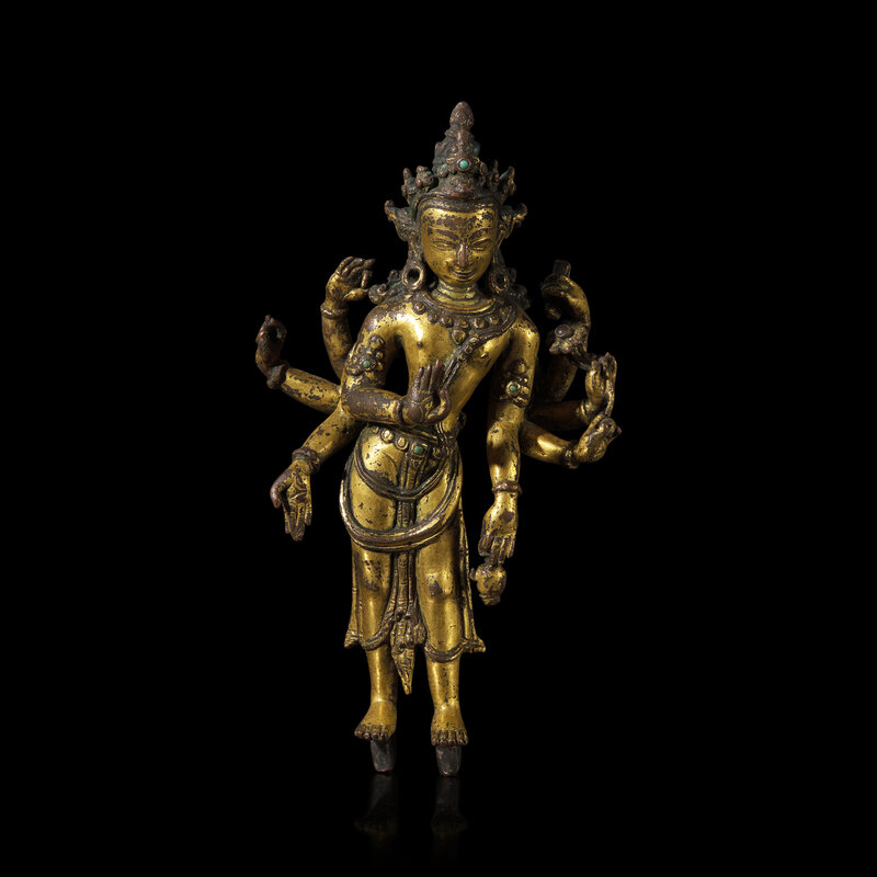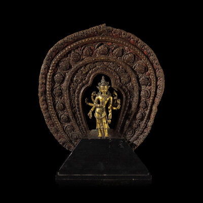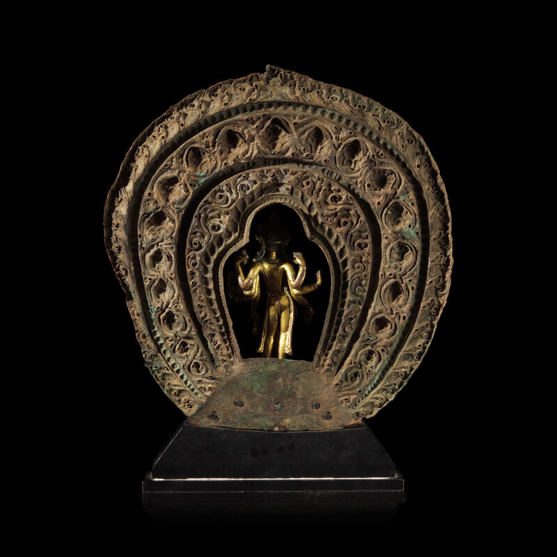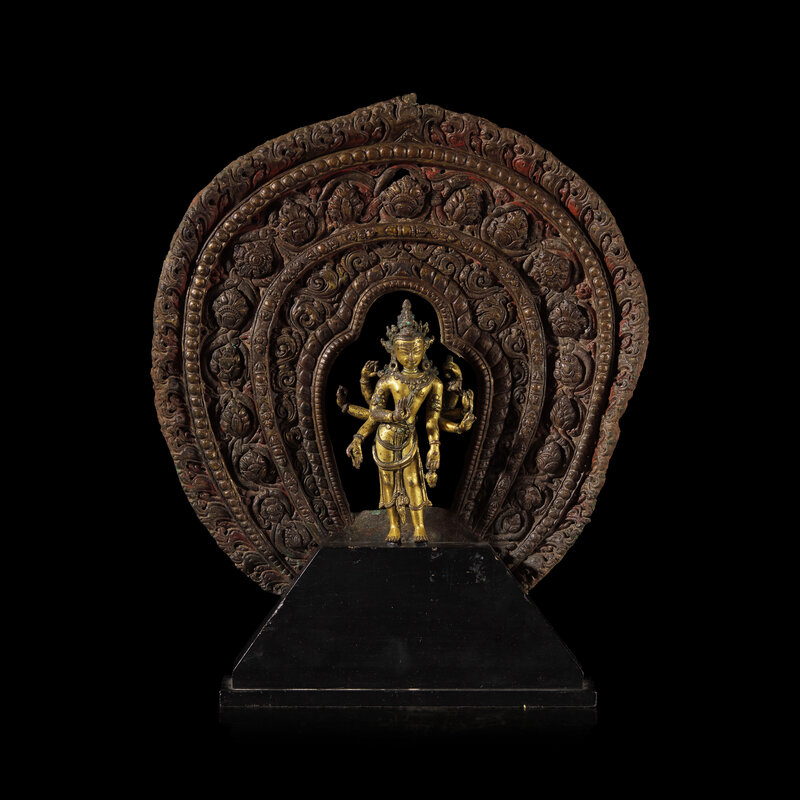 The lithe crowned and bejeweled Bodhisattva of Compassion depicted as Amoghapasa, with six arms bearing various attributes, standing in tribhanga, mounted on a later ebonized base with associated Nepalese repousse-worked flaming mandorla with central border of stylized blossoms.